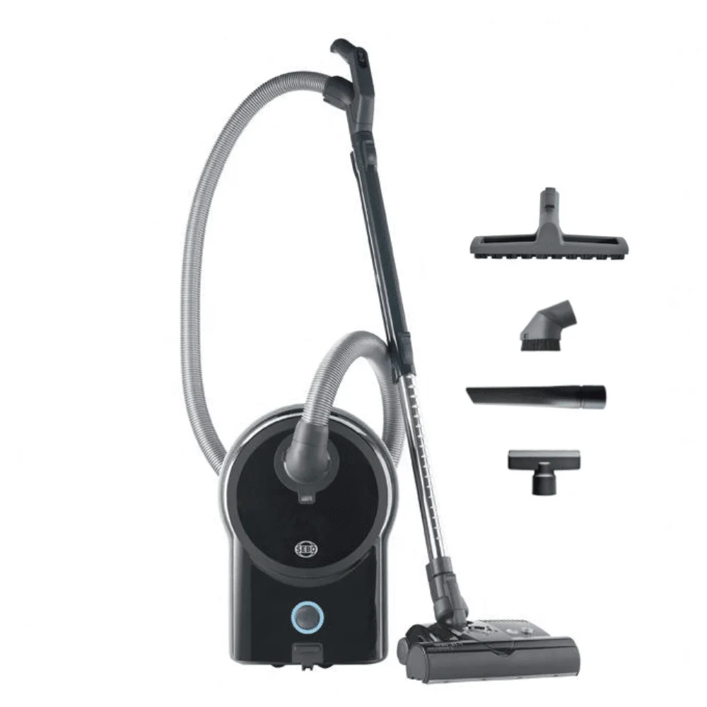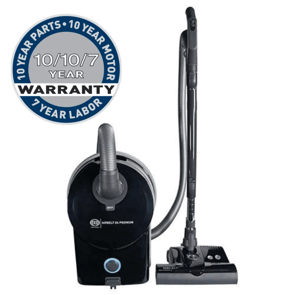 The AIRBELT D4 model is a powerful, full-size, ultra-quiet, canister vacuum cleaner with three on-board attachments, a giant 1.5-gallon bag, an unmatched 40-