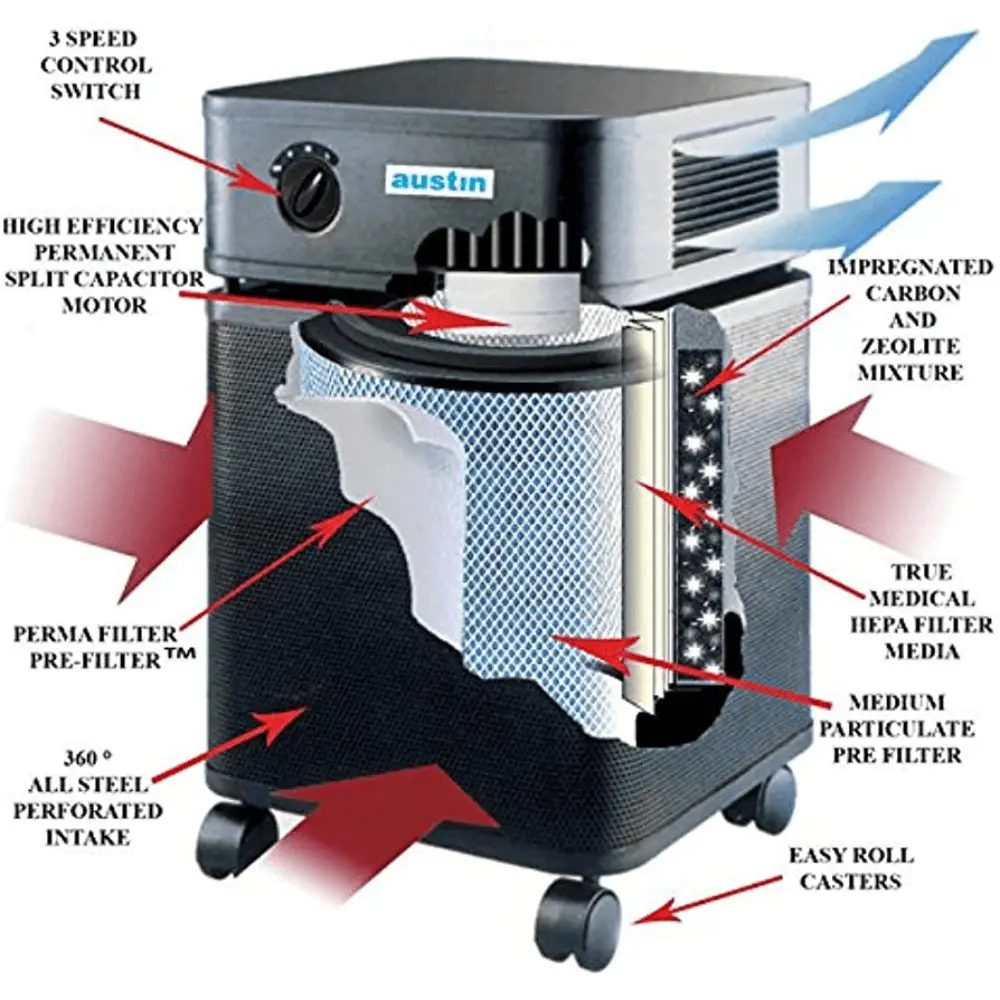 The Austin Air HealthMate use their signature 360-degree progressive filtering system to remove the most symptom-aggravating allergens, odors, and chemicals from your home. With steady use, you may see a reduction in your allergy, asthma, and multiple chemical sensitivity (MCS) symptoms or even eliminate them all together.