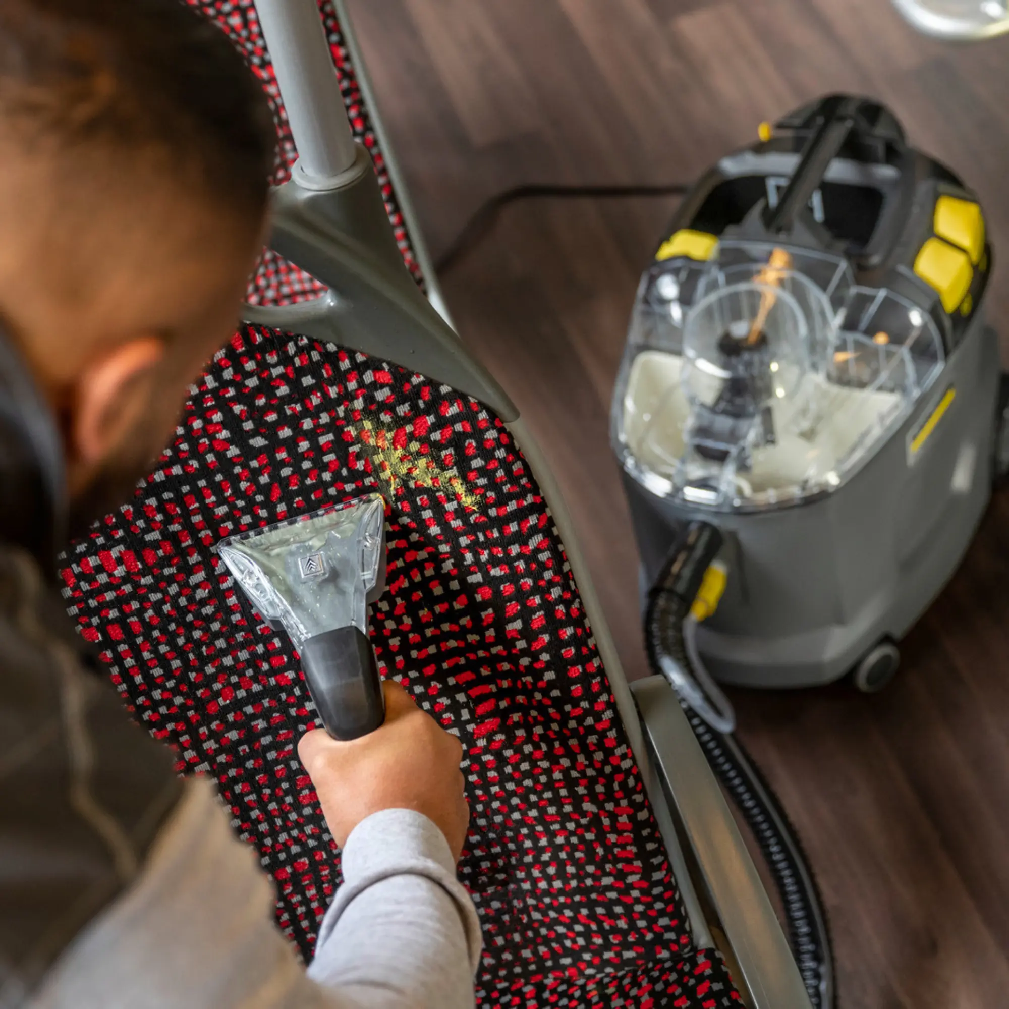 Karcher’s Puzzi 8/1 carpet extractor impressively cleans upholstery and removes stains from carpet and fabric surfaces with outstanding and hygienic cleaning results and high efficiency. This compact machine sprays the cleaning solution deep into the fabric fibers. By dislodging dirt and then extracting it along with the solution.