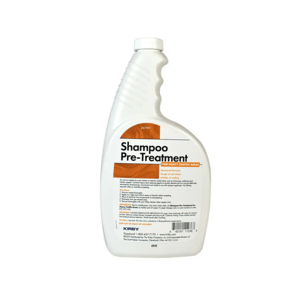 The Kirby Shampoo Pre-treatment is for use on carpets as stain remover before shampooing your carpet. It is great to use in heavily soiled area, such as entryways, walkways, stairways, kitchen, and family rooms. The pre-treat contains heavy duty cleaning agents that quickly dissolve soil that can be easily and effectively removed by shampooing. The Pre-treat Shampoo can be used on all colorfast carpeting. Professional strength, just spray on and then blot the stain away with a clean with cloth. Use to get out the toughest stains such as blood, oil, pet stains, cosmetics, crayon, dirt, lipsticks, grass, grease, vomit, grime, most inks, mud, rust, saliva, soil, tobacco, and urine