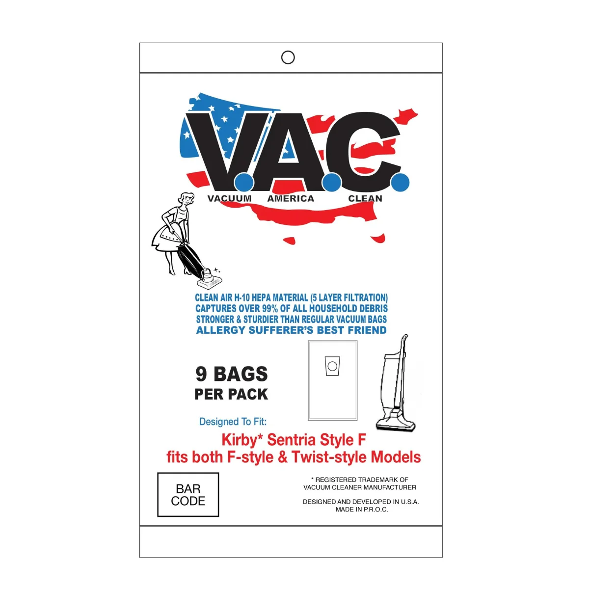 Vacuum America Clean HEPA Vacuum Bags Designed To Fit Style F Kirby Sentria Vacuums. Clean Air H-10 HEPA Material. 5 Layer filtration captures over 99 percent of all household debris. Stronger and sturdier than regular vacuum bags. Allergy sufferer’s best friend.