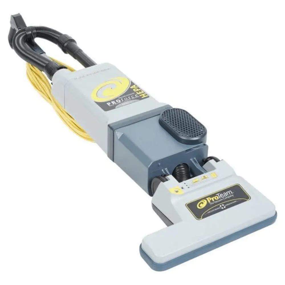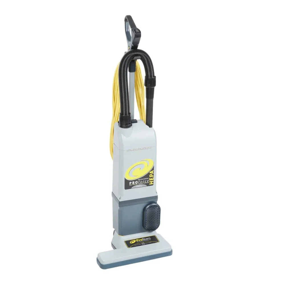 Remove dirt, dust and debris from carpeting with this ProTeam ProForce HEPA upright vacuum cleaner.Equip your janitorial team with this upright vacuum cleaner for an efficient way to keep your office clean. The HEPA filtration system removes up to 99.97 percent of particulates as small as 0.3 microns, making this cleaner ideal for use in schools, hospitals and other environments where allergies are a concern. A set of onboard tools makes it easy to reach corners, crevices and other tight spaces, while the wide base clears larger areas of carpet in a single sweep. This vacuum features a simple three-way power switch for effortless operation and an ergonomic handle for a more comfortable grip. A dual-motor system delivers powerful operation, providing an ideal option for commercial use. Boasting a 50-foot safety-yellow power cord, this ProTeam ProForce upright vacuum cleaner offers an extended reach and eliminates the need for extension cords.