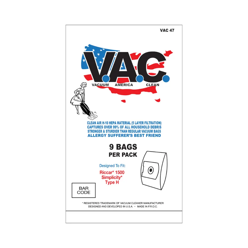 Introducing the Riccar / Simplicity Type H Canister Vacuum bags (9-Pack), the ultimate solution for maintaining a clean and dust-free home. Designed specifically for Simplicity canister vacuums that require Type H bags, this pack of 9 bags ensures that you have an ample supply to tackle all your cleaning needs.