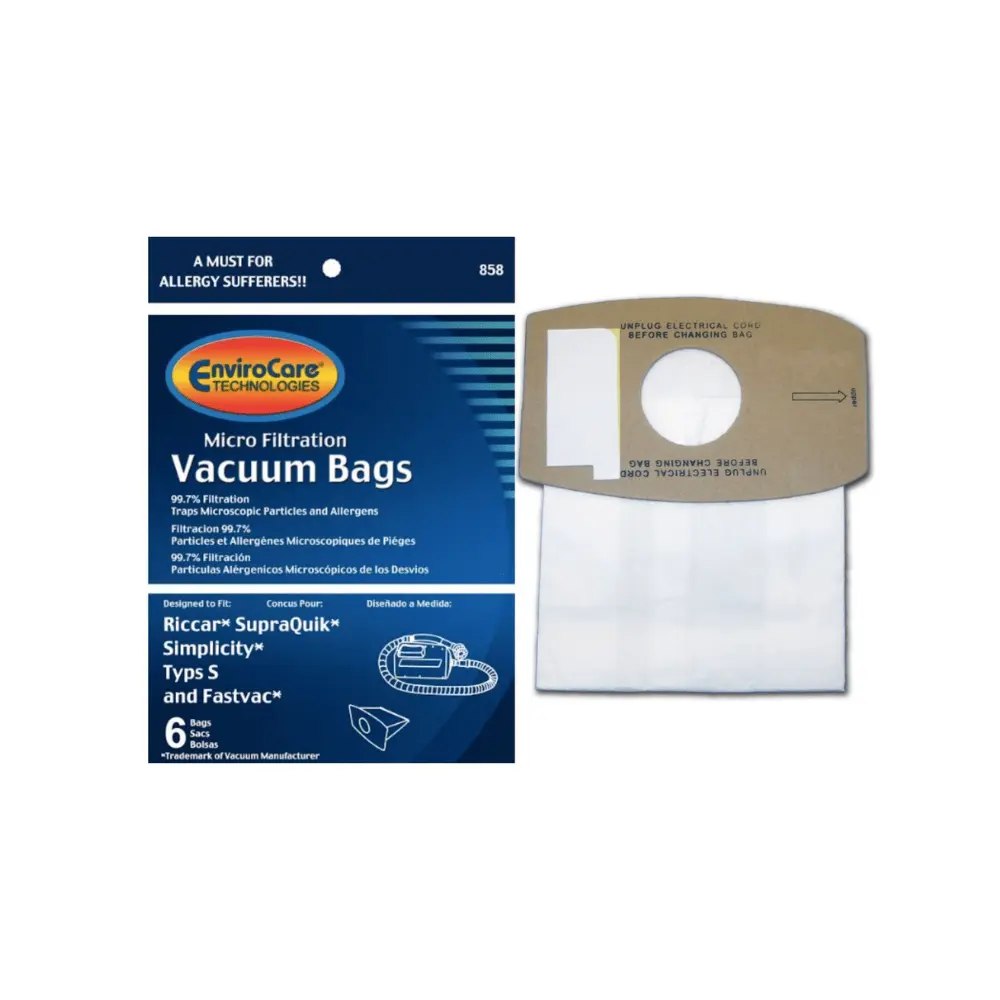 Bag fits Riccar model SupraQuik and Simplicity Sport portable vacuum cleaner. With Micro Filtration vacuum bags this bag will catch up to 99.7% of microscopic particles and allergens. Leaving the air coming out of the machine fresh and clean. This is a Must for Allergy Sufferers!! EnviroCare Tecnologies using a high filtration bag to trap and hold microscopic particles.