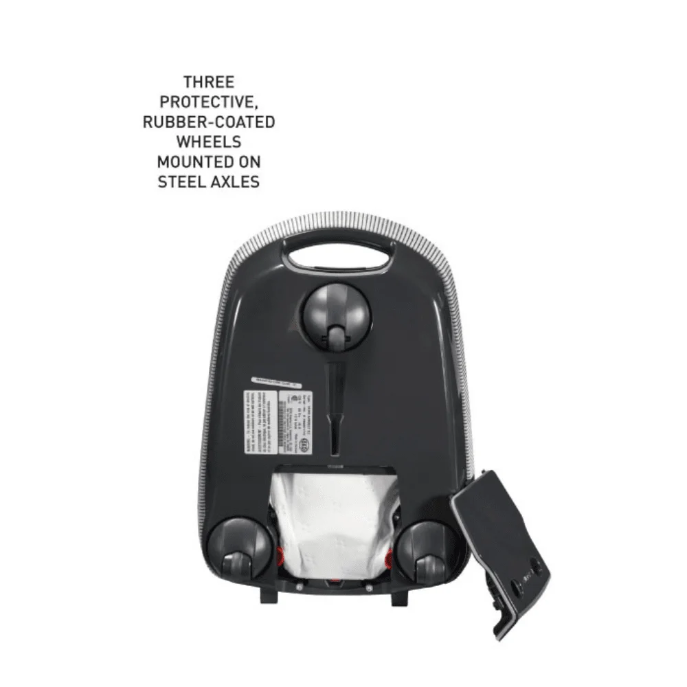 Powerful, ultra-quiet, mid-size canister vacuum cleaners with attractive curves and contours that feature three on-board attachments, a large .92-gallon bag, a generous 25-foot cord and 37-foot cleaning radius, protective rubber-coated wheels, a durable telescopic tube with quick-release connections, and a full bag or clog indicator. They also feature excellent filtration, a push-button cord rewinder, and a soft-foam bumper that protects the vacuum, furniture, and walls from scuffs and scratches.