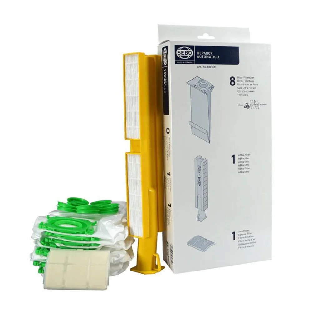 he Sebo’s filtration system ensures high filtration to remove dust, dirt, and allergy-causing particles without recirculating it into the living areas. SEBO HEPA Service Box for X series uprights contains 8 cloth filter bags and bag lids, 1 microfilter, and 1 HEPA filter.