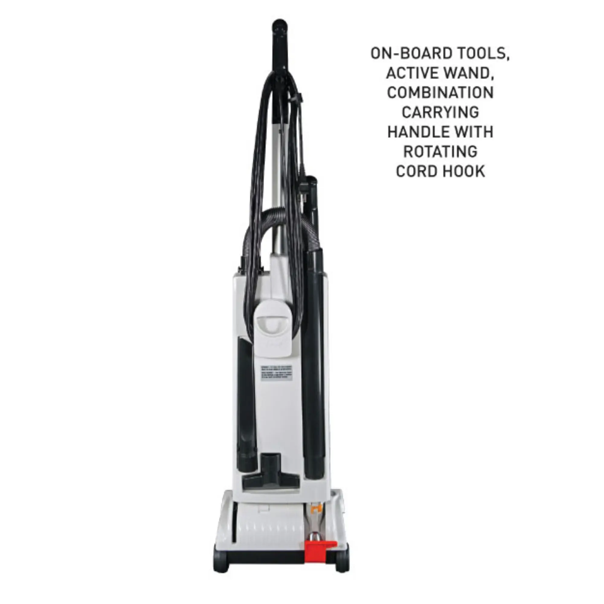The user is alerted to clogs, a worn brush, or a full bag, and the vacuum automatically shuts off when brush obstructions occur to protect the motor and belts from damage. The X also has an instant-use cleaning wand and suction hose, a lifetime belt warranty, tool-free brush roller removal, a 40-foot power cord, and three on-board attachments.