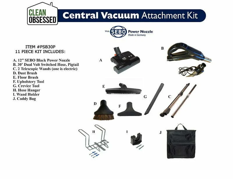 Introducing the SEBO / Clean Obsessed Central Vacuum Attachment Kit (PSB30P15). A comprehensive set of high-quality cleaning tools designed to enhance the performance of your central vacuum system. This attachment kit provides you with a complete arsenal of accessories to tackle all your cleaning needs efficiently and effectively.