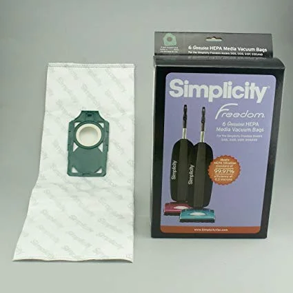Genuine HEPA media bags for Simplicity Freedom S10 vacuum models with self-sealing green bag collar. Pack of 6 bags.