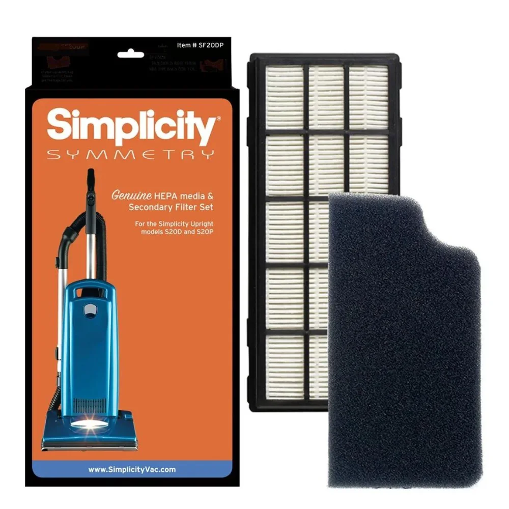 Simplicity Genuine HEPA Media And Electrostatic Filter Set For Symmetry – The two filters in the Simplicity Genuine HEPA Media and Electrostatic Filter Set for Symmetry (SF20DP) trap particles and filter the exhaust air. This replacement filter set fits the Simplicity Symmetry S20D, S20P and S20UP models as well as the Riccar Vibrance Deluxe R20D and Premium R20P Upright Vacuum models. This Simplicity Symmetry SF20DP filter set comes with one HEPA media filter and one secondary electrostatic foam filter. HEPA filters remove up to 99.97% filtration at 0.3 microns of allergens and other dust particles and are ideal for anyone who suffers from allergies or asthma. Replace filters regularly to help ensure lasting suction and filtration performance for your vacuum.