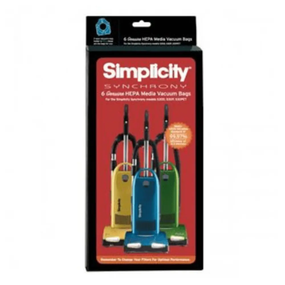 Genuine HEPA media replacement bags for Simplicity Synchrony series S30 models. Bags feature the self-sealing blue bag collar. Six bags per pack.