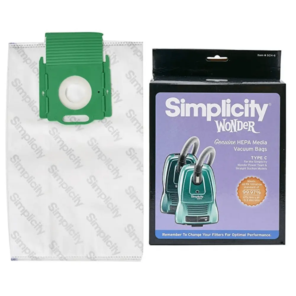 Genuine HEPA media replacement bags for Simplicity Wonder Canister models. Bags feature the self-sealing green bag collar. Six bags per pack.