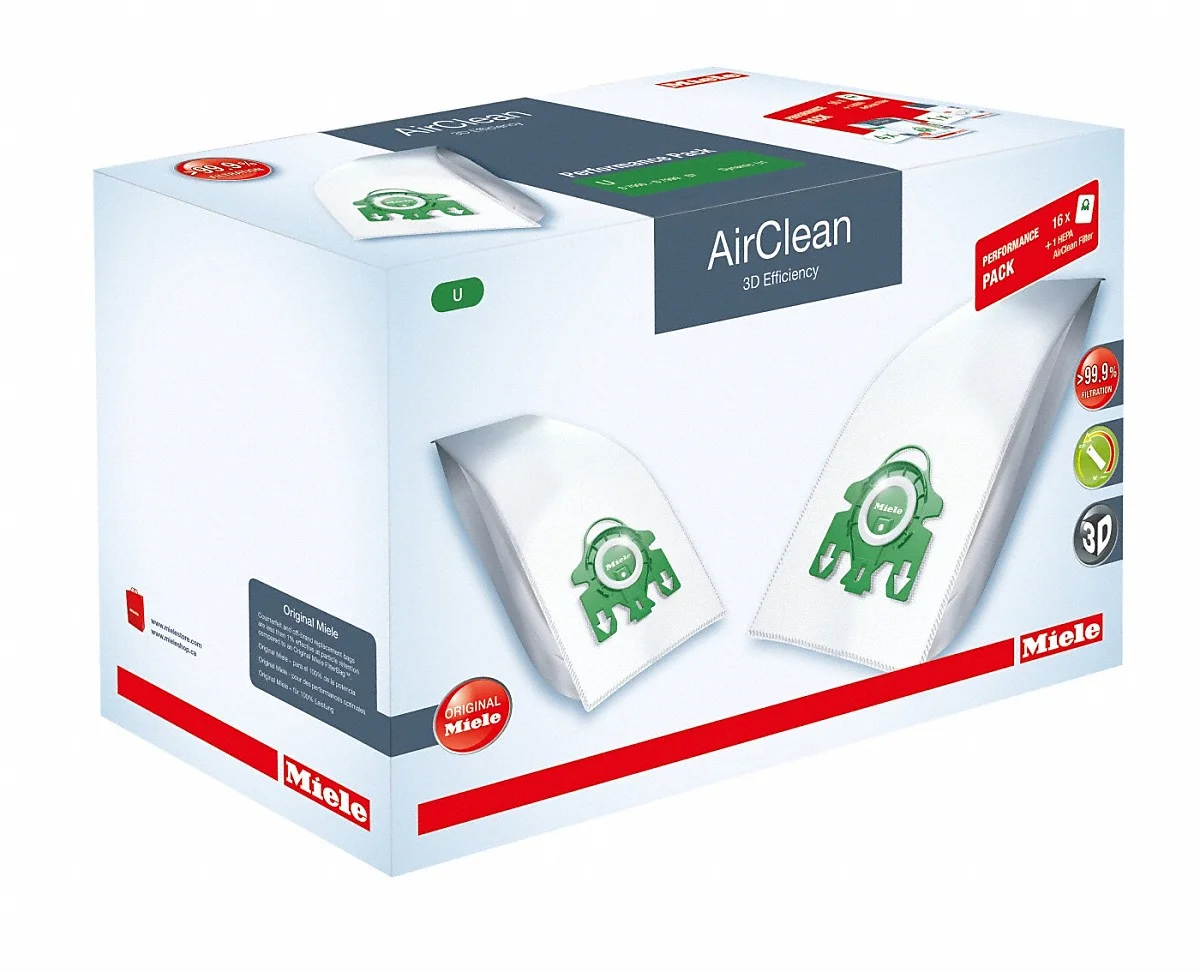 Each Performance Pack contains sixteen genuine Miele FilterBags™ and an AirClean HEPA Filter. Original Miele FilterBags™ and Miele HEPA AirClean filters help to form the advanced Miele AirClean System™, which ensures a dust rentention capacity of more than 99.99%. Counterfeit and off-brand replacement bags are less than 1% effective at particle retention compared to an Original Miele FilterBag™.
