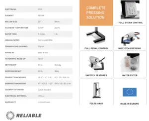 The Verve 100SR rotary steam press is a modern take-on the Mangle from the past. Made with precision craftsmanship and commercial grade machining in theCzech Republic the Reliable Verve has firm roots in the centuries old art of pressing. This is truly the best in class, with a value second to none with variable steam and temperature settings all at 120V. No need to arrange any electrical work. Plug and go!The Verve 100SR takes the hassle out of pressing large items while saving precious time. The 33” open-end roller can be fed from both sides and will accommodate a wide variety of clothing as well. The steam functions and precise temperature setting options offer an elite level of fabric care and make quick work of large tasks. Press the old-fashioned way – with the ease of Reliable technology.